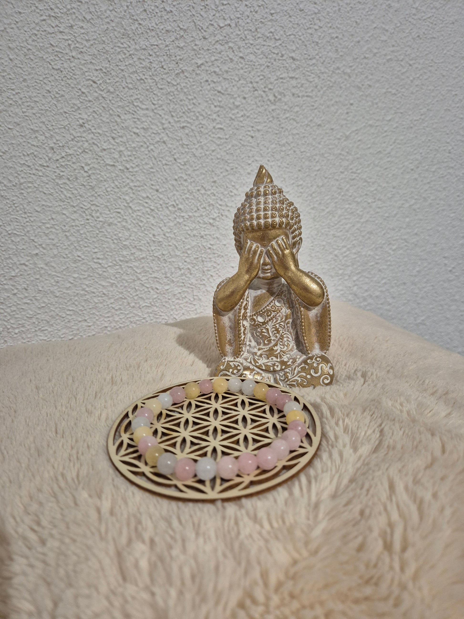 Chaque perle, douce et cristalline, palpite d’une énergie sereine, comme une promesse chuchotée au creux du silence. C’est un bijou qui ne crie pas, mais qui rayonne avec grâce, portant en lui l’élégance du calme et la poésie de l’amour sincère