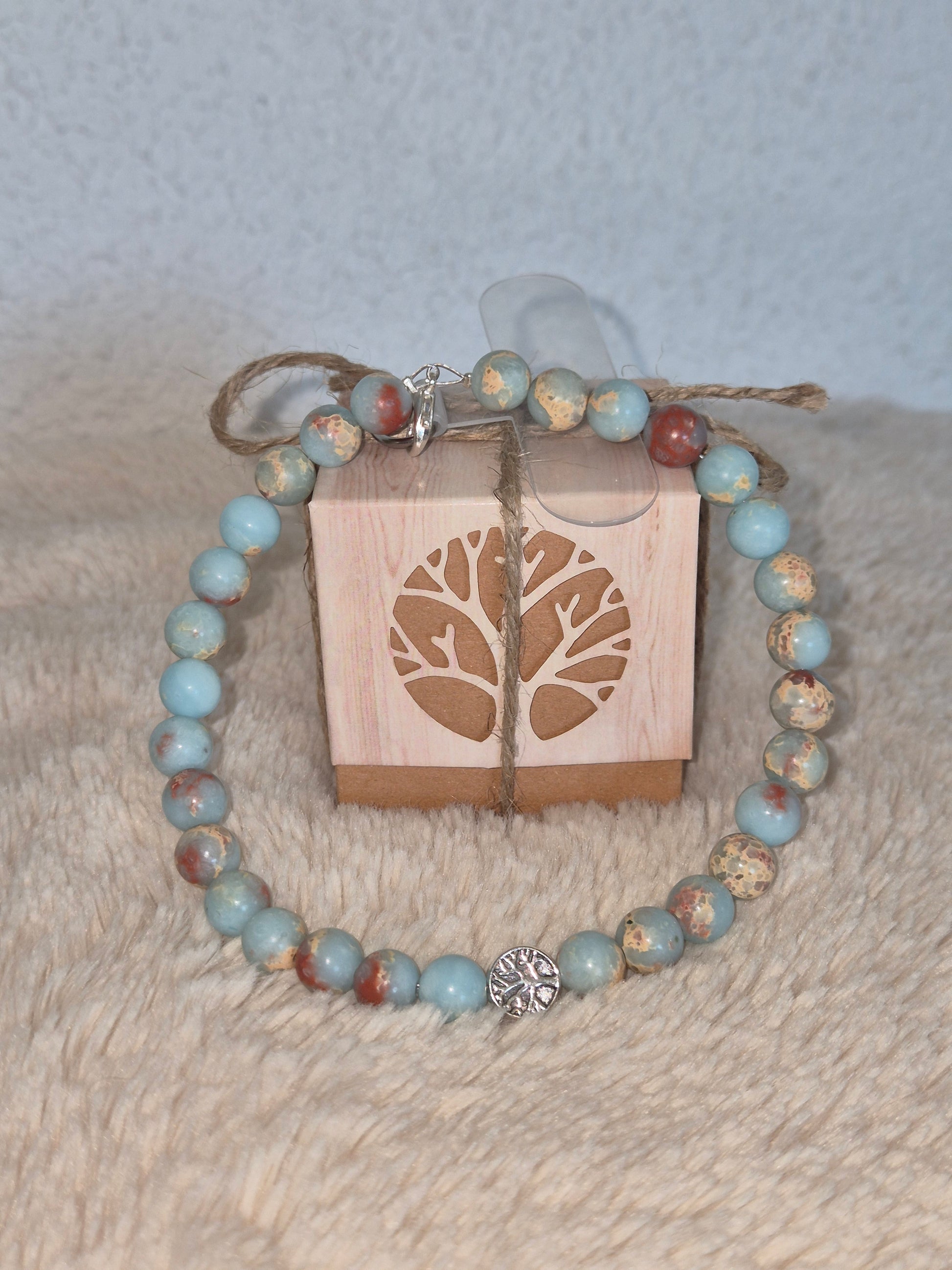 Pierre d’ancrage et de vitalité, le jaspe diffuse une énergie apaisante, tandis que l’Arbre de Vie incarne l’harmonie, la croissance et la connexion aux racines.