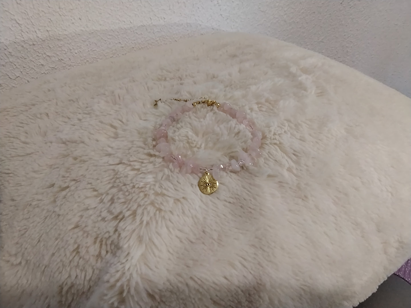 Ce bracelet délicat associe la douceur naturelle du quartz rose, pierre de l’amour et de l’harmonie, à une pampille œil protecteur en acier inoxydable, résistante et intemporelle.
