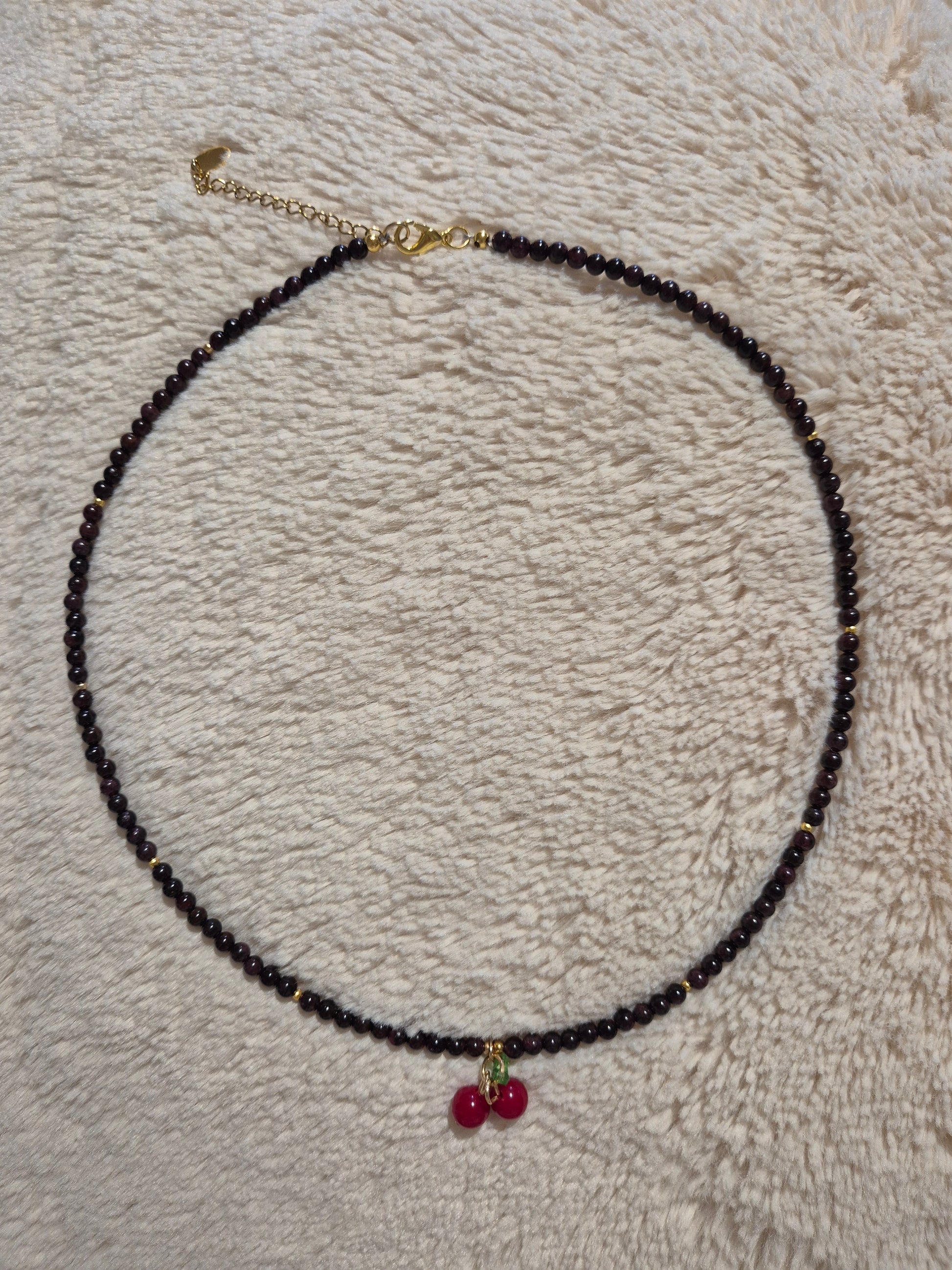 Succombez au charme intense de ce collier en Grenat, sublimé par une délicate breloque cerise.