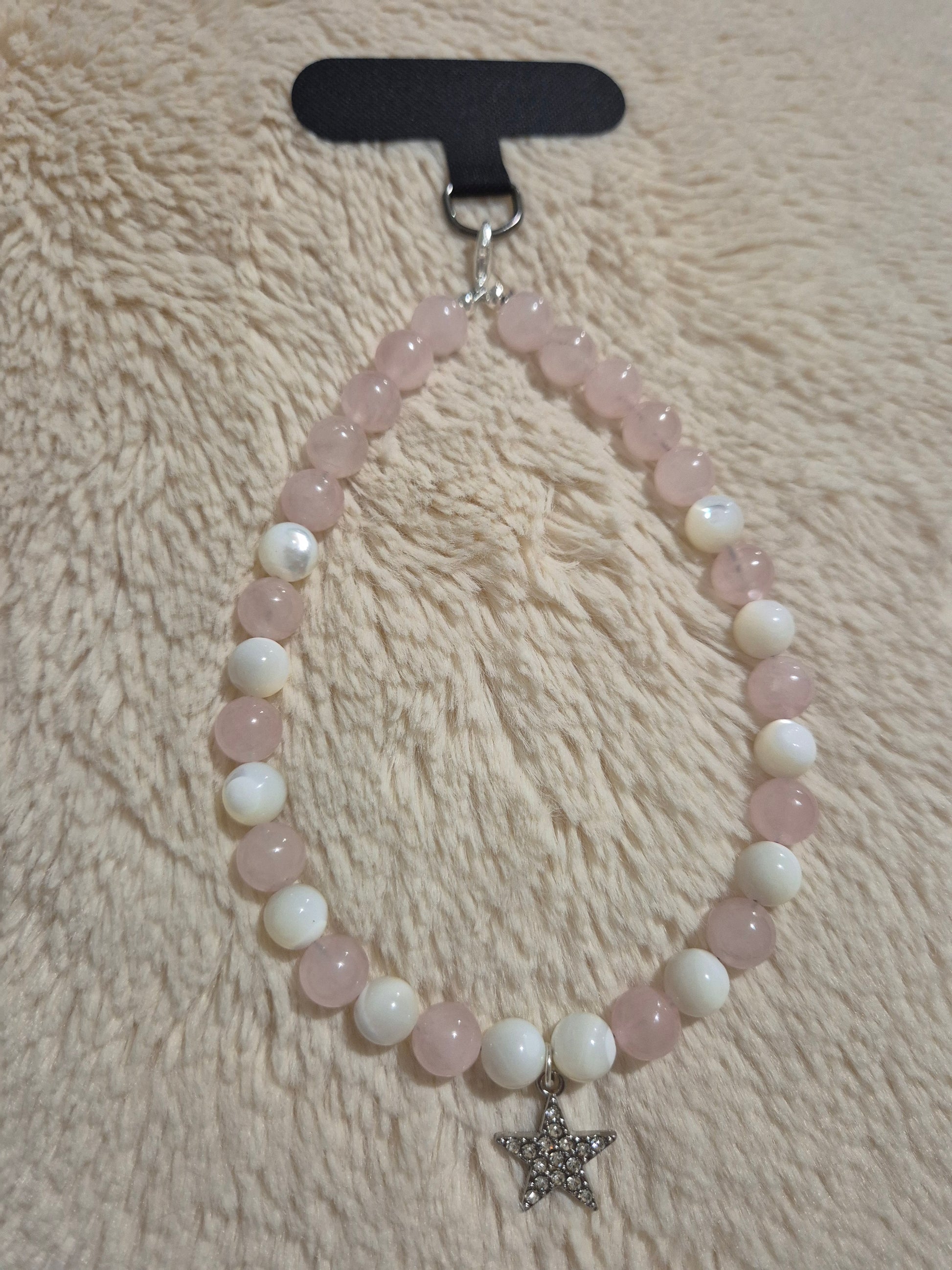 Délicat et élégant, ce bijou de portable associe le quartz rose, pierre douce aux teintes poudrées, à la nacre naturelle aux reflets irisés. La breloque étoile apporte une touche poétique et lumineuse, idéale pour personnaliser votre téléphone avec raffinement.