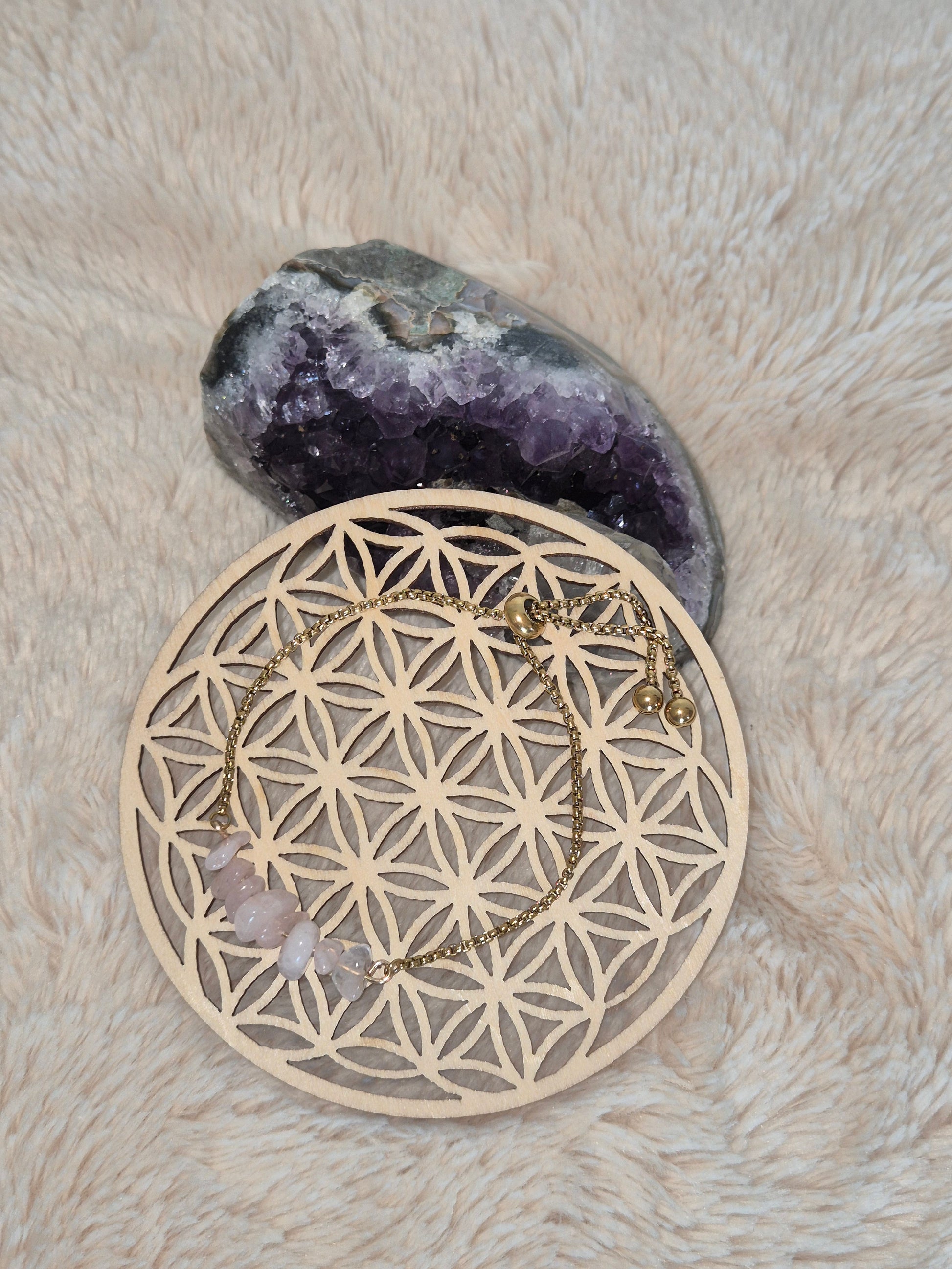 Au cœur de son éclat repose le Quartz Rose, pierre tendre et bienveillante, messagère d’amour et de sérénité.