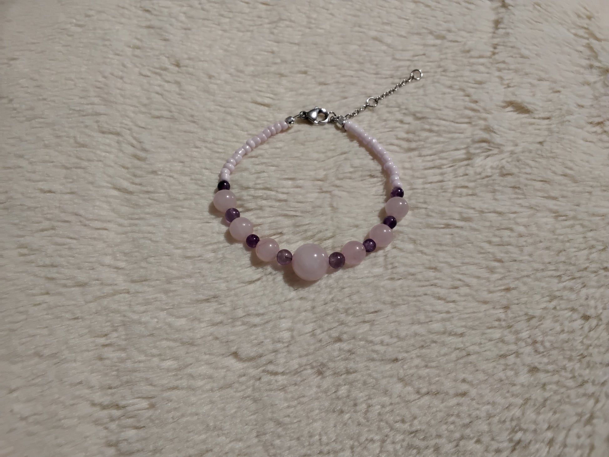 Laissez-vous envelopper par l’énergie douce et bienfaisante de ce bracelet en pierres naturelles d’améthyste et de quartz rose, alliance parfaite entre paix intérieure et amour universel.