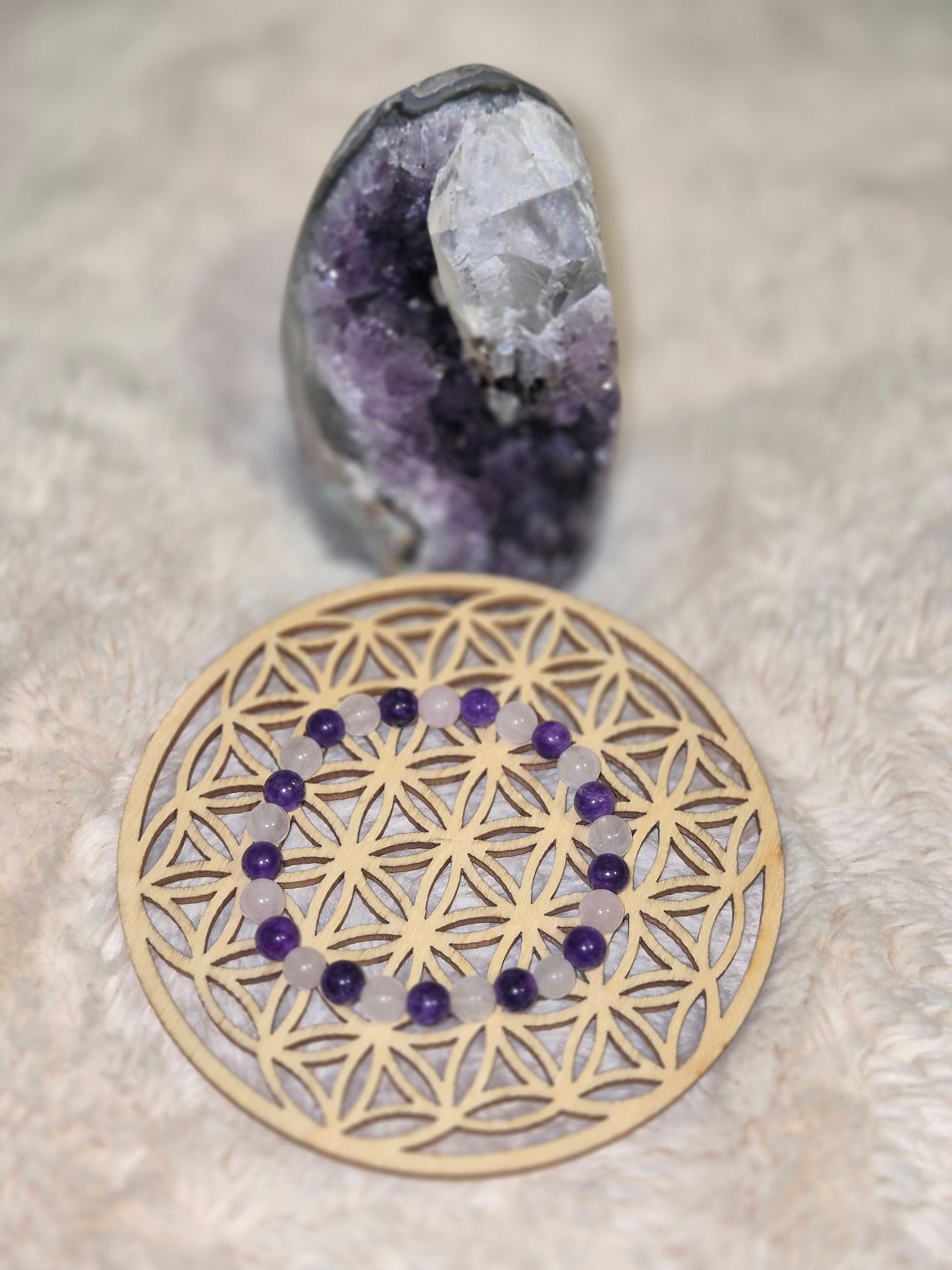 Entre la profondeur violette de l' améthyste et la tendresse rosée du quartz rose , ce bracelet incarne l'équilibre parfait entre sagesse et amour. Chaque perle diffuse une énergie apaisante, pour un bijou à la fois protecteur et raffiné.
