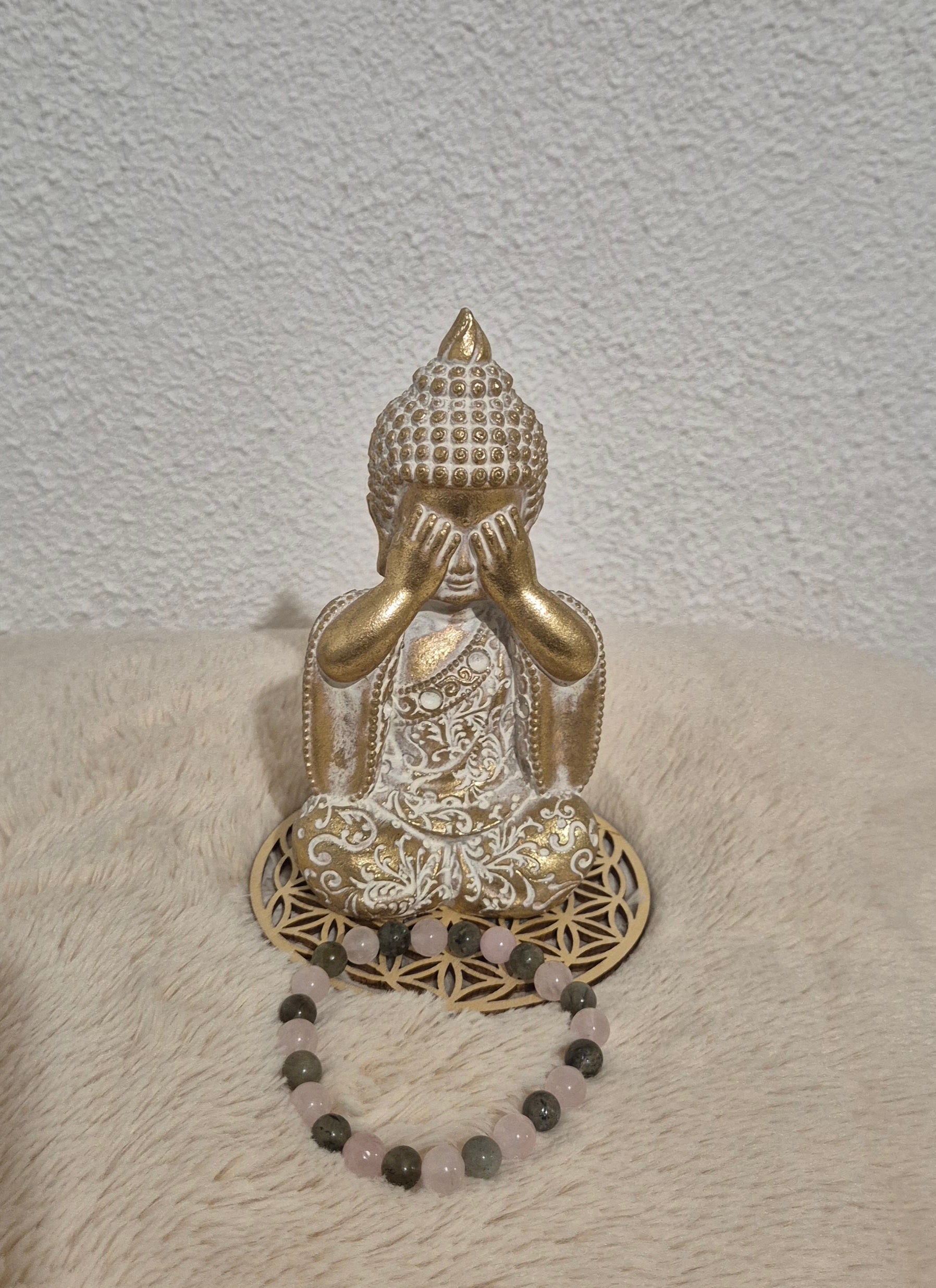 Ensemble, ces deux gemmes créent une harmonie subtile : la pierre de lune guide l’esprit vers la sérénité intérieure, tandis que le quartz rose ouvre le cœur à la bienveillance et à la tendresse. Porté au poignet, ce bracelet devient un talisman de féminité, de douceur et d’équilibre, un bijou qui chuchote l’alliance sacrée entre l’amour et l’intuition.