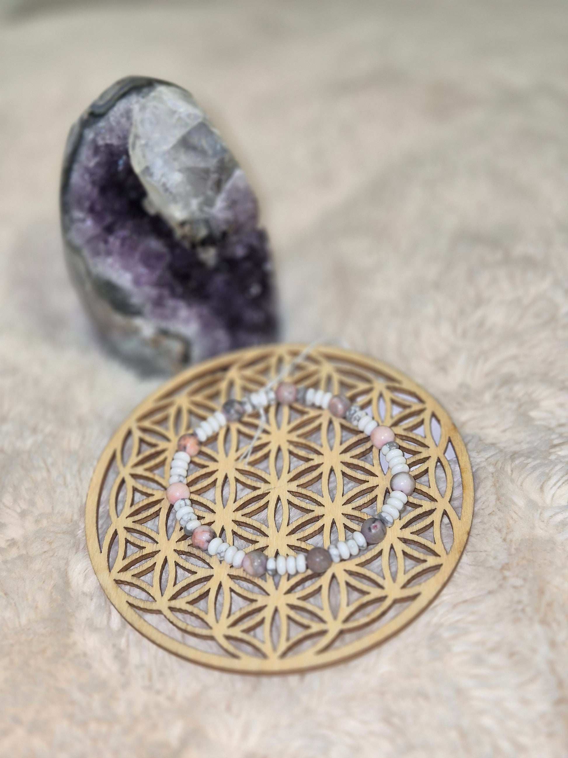 Entre le blanc veiné de la howlite, pierre de calme et de sagesse, et les nuances tendres de l’opale rose, pierre d’amour et de réconfort, ce bracelet diffuse une énergie douce et apaisante. Un bijou délicat qui équilibre esprit et cœur, à porter au quotidien comme une touche de lumière.