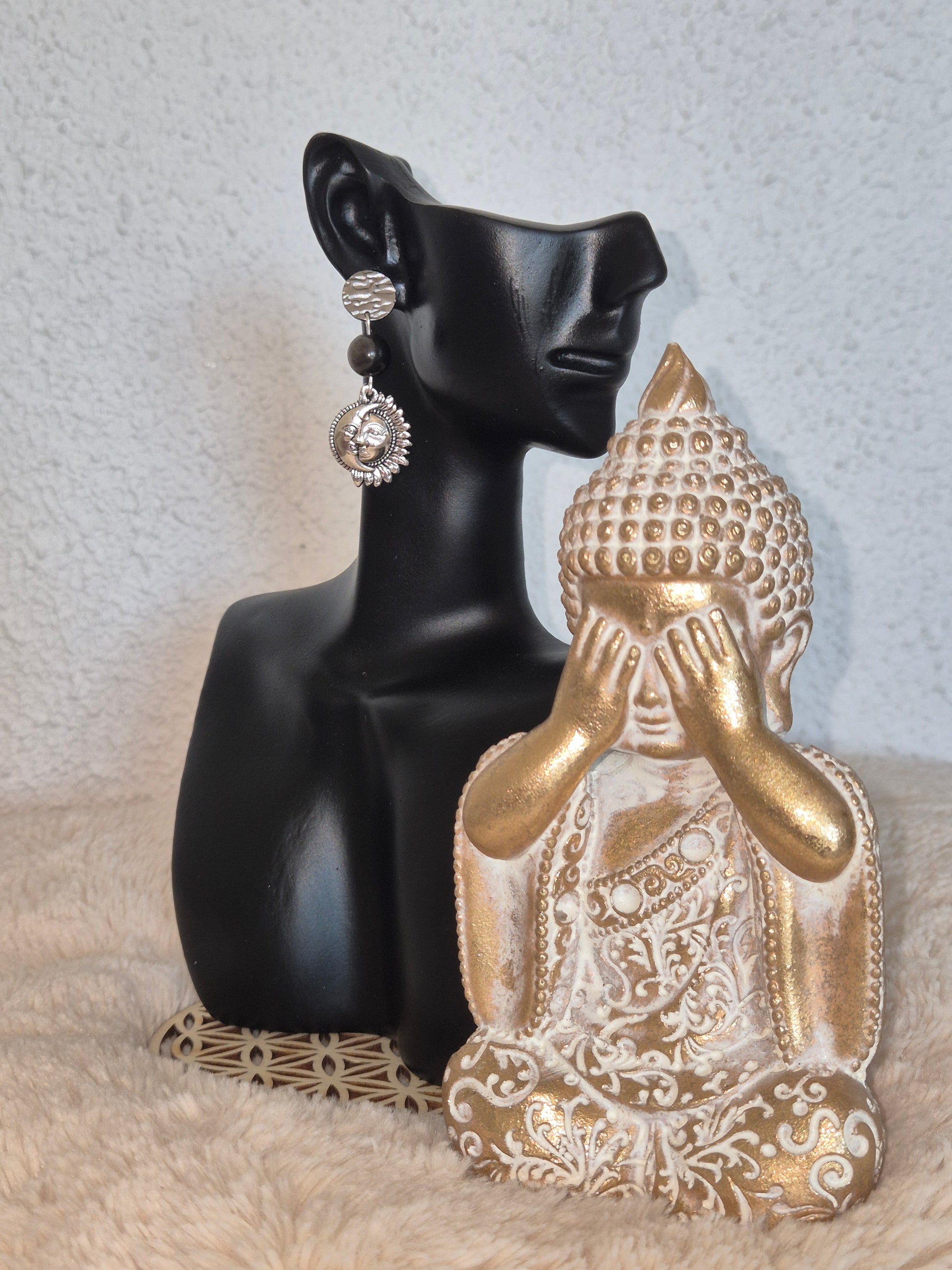 Dans l’éclat argenté de l’acier inoxydable se suspend l’obsidienne, pierre mystique aux reflets nocturnes.