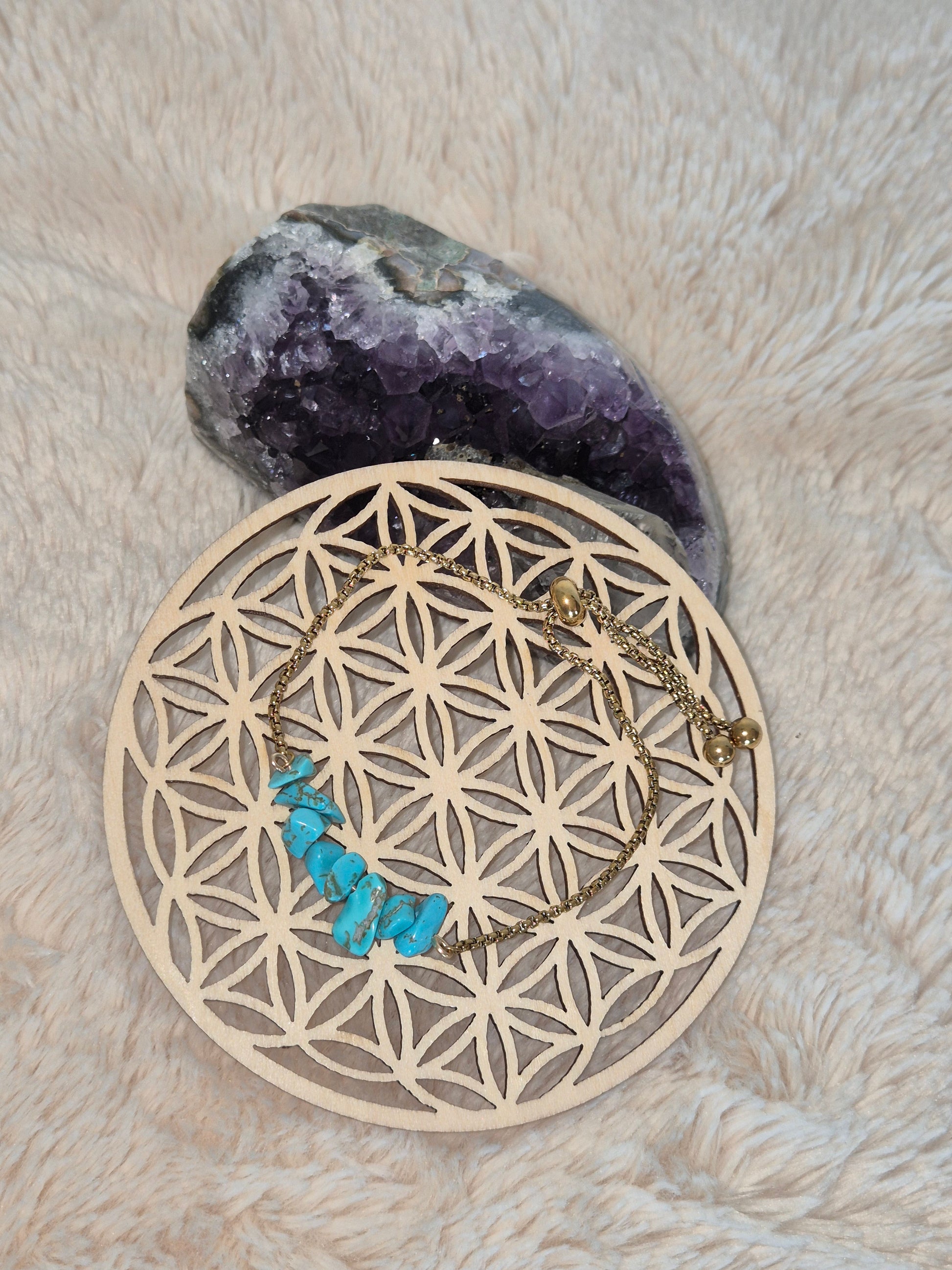 Ce bracelet allie élégance et énergie spirituelle. La délicate chaînette dorée en acier inoxydable met en valeur la howlite turquoise, pierre naturelle aux vertus apaisantes et spirituelles qui accompagne vos méditations, vos moments de recentrage ou simplement votre quotidien avec douceur et protection.