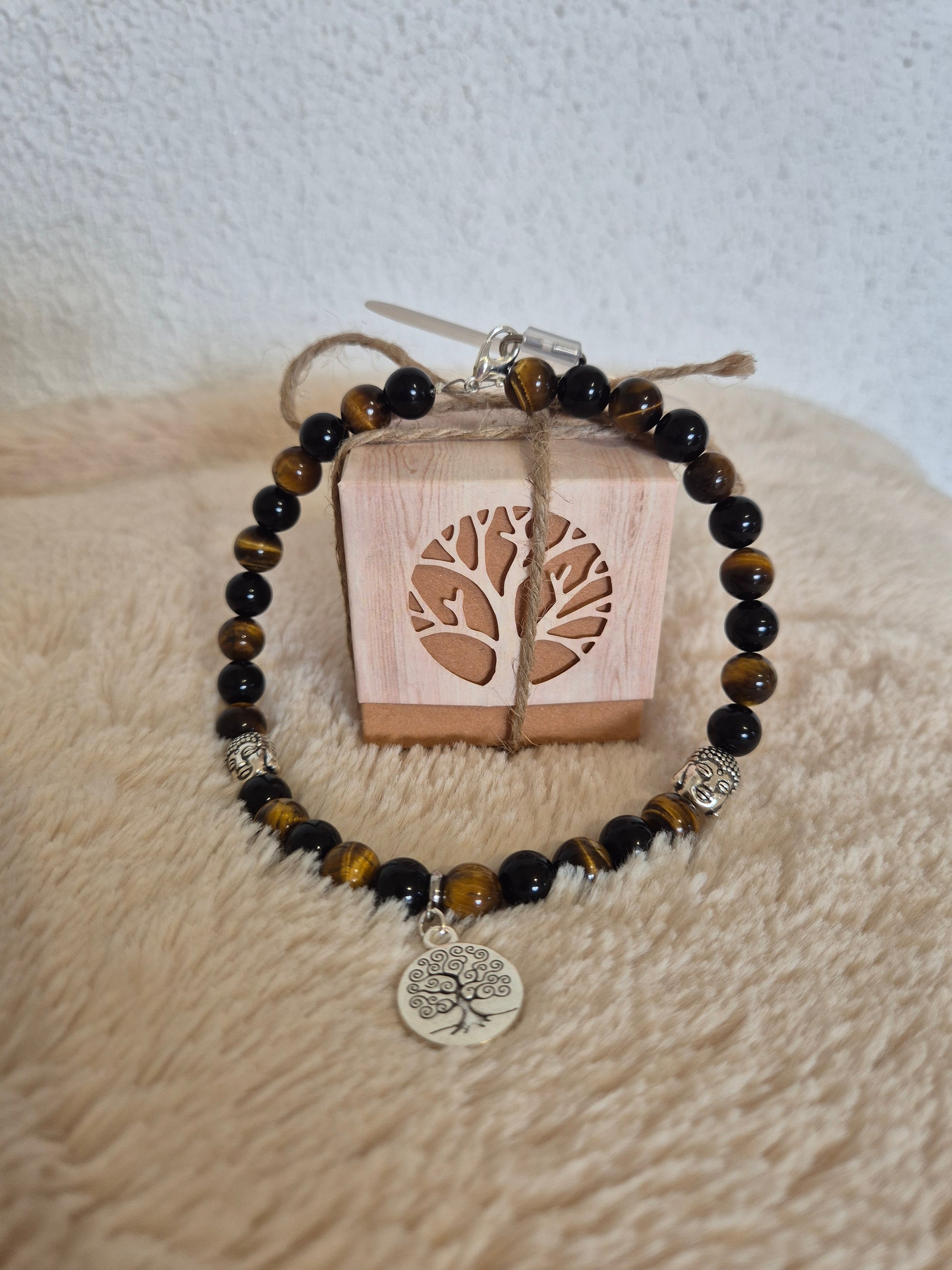 Ce bijou de portable allie pierres d’œil de tigre et breloques Bouddha et Arbre de Vie pour créer un accessoire à la fois élégant et porteur de sens. Fabriqué en acier inoxydable, il est durable et raffiné, parfait pour accompagner votre quotidien.