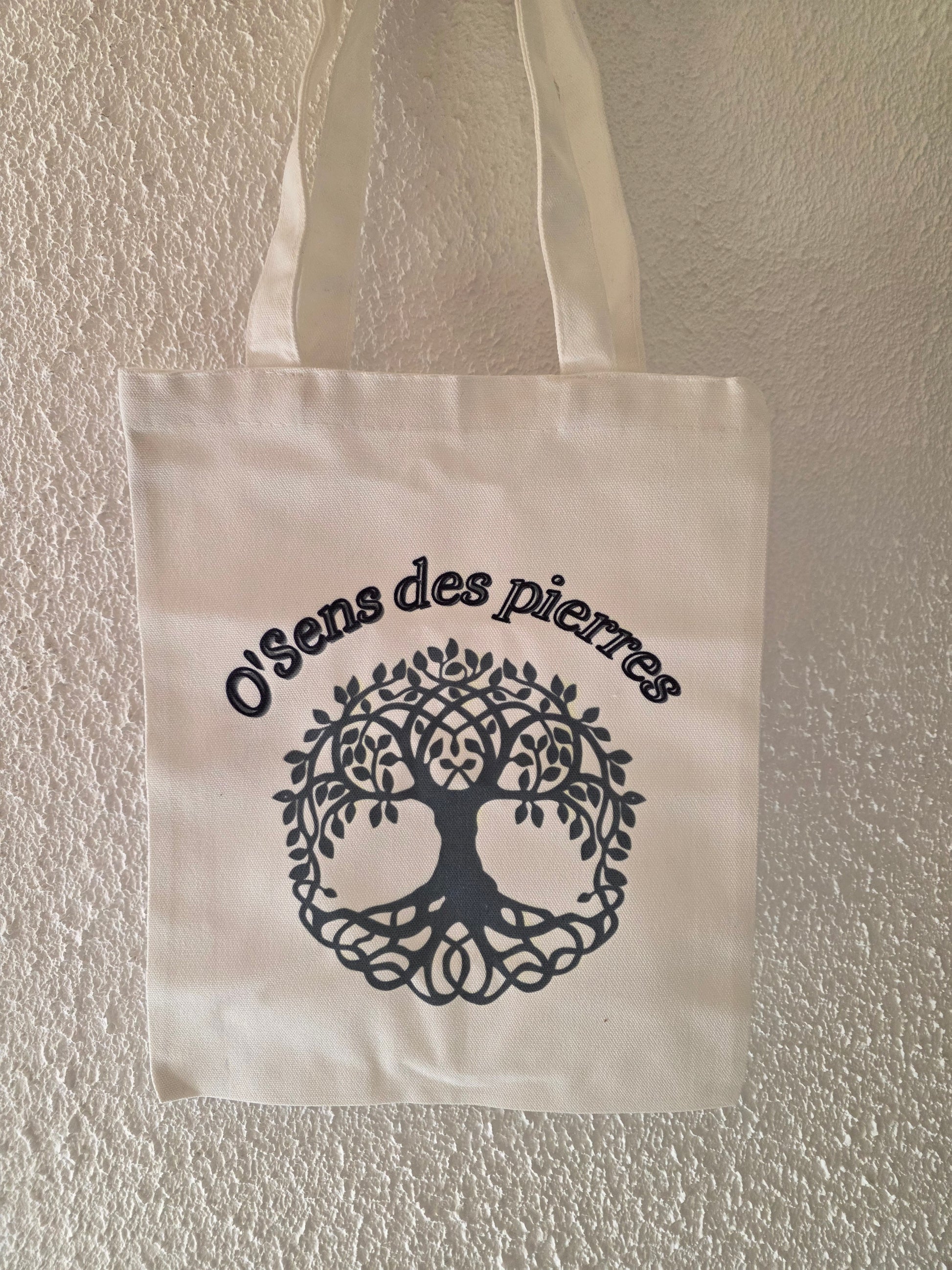 Sac en tissu léger et résistant signé Ô’Sens des pierres, orné de son logo élégant. Pratique et écoresponsable, il est idéal pour transporter vos essentiels au quotidien avec simplicité et style.