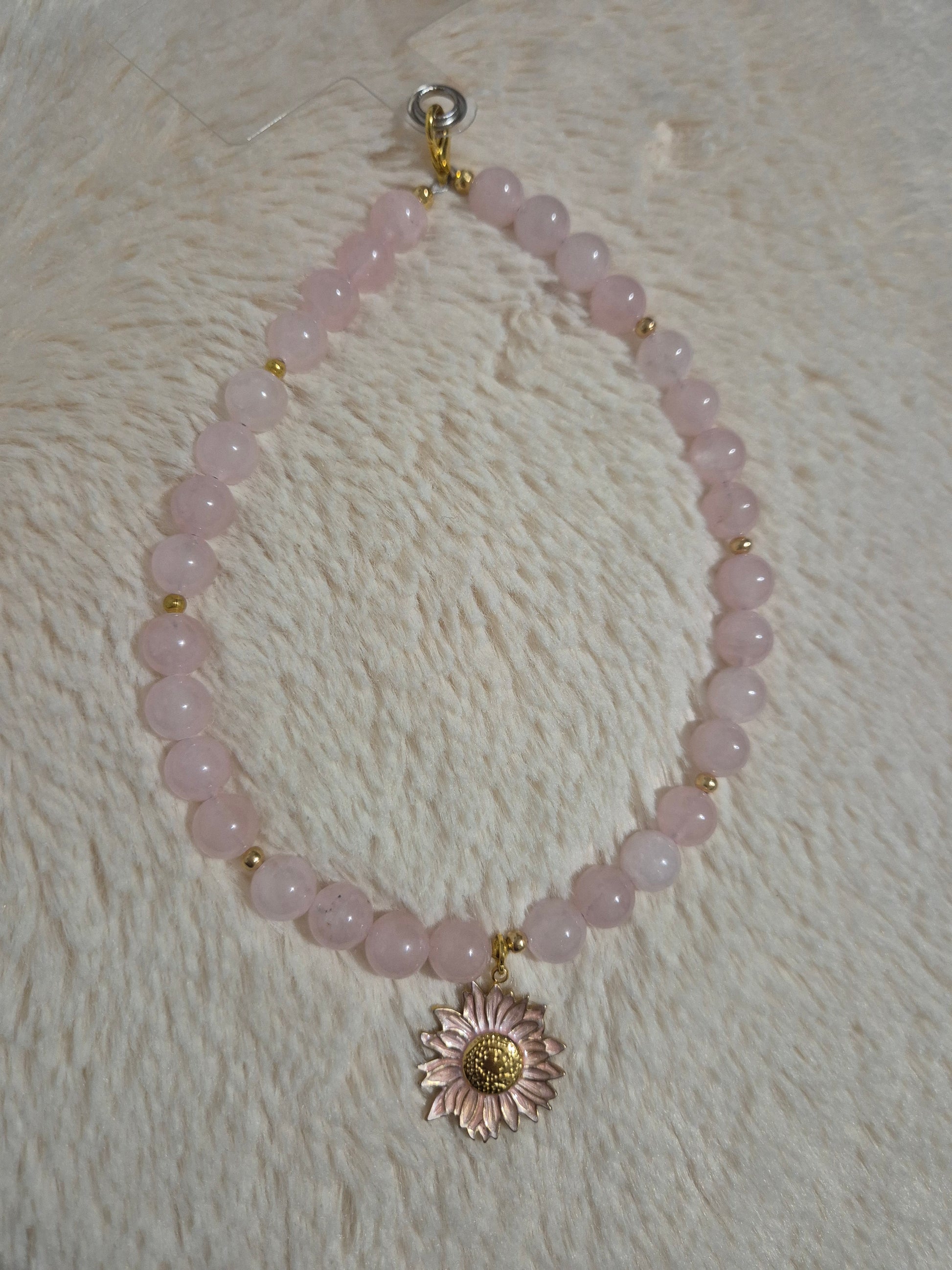 Ce bijou de portable mêle la tendresse du quartz rose, pierre du cœur et de l’amour délicat, à l’éclat subtil d’une breloque fleur dorée, teintée d’un rose pâle lumineux.