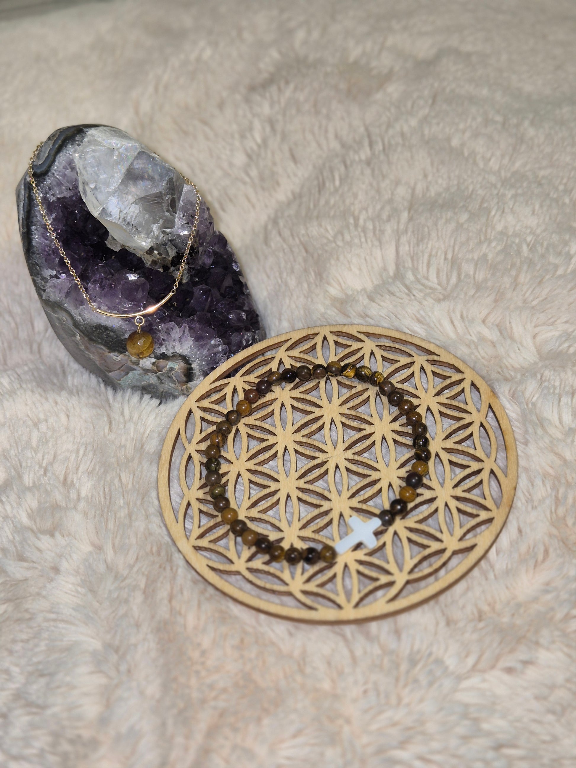 Ce duo de bracelets uniques mêle la force des perles œil de tigre , pierre protectrice aux reflets dorés, à l'éclat délicat d'une croix en nacre , symbole de pureté et de lumière. Son duo avec la chaînette en acier inoxydable vient sublimer l'ensemble pour un bijou à la fois puissant, élégant et intemporel.
